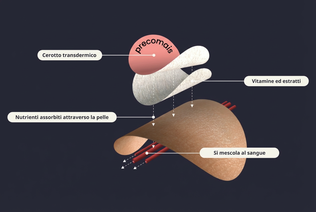 I Cerotti Precomais sono progettati per rilasciare i loro ingredienti direttamente attraverso la pelle, permettendo un assorbimento graduale e continuo, senza passare dal sistema digestivo.